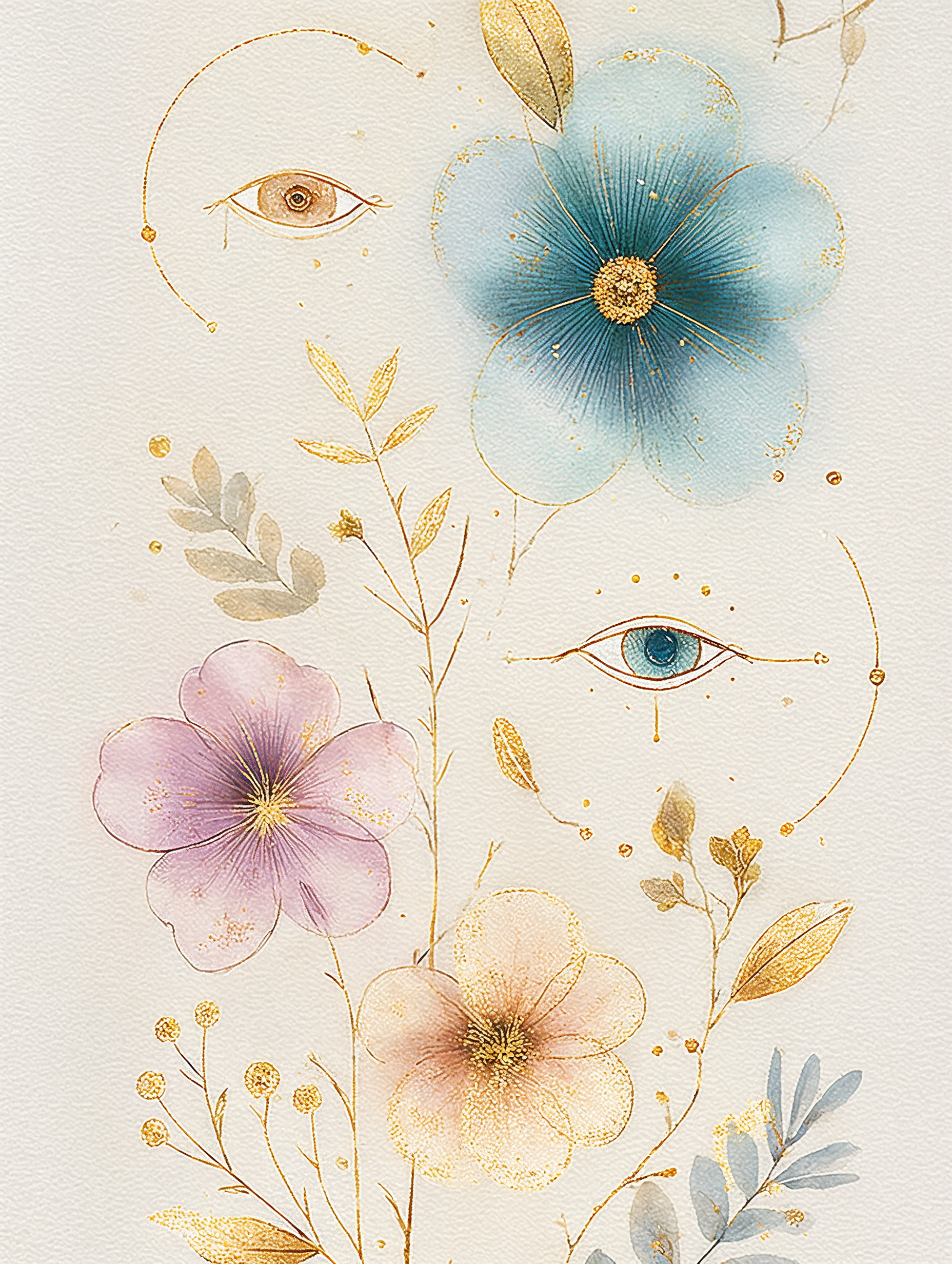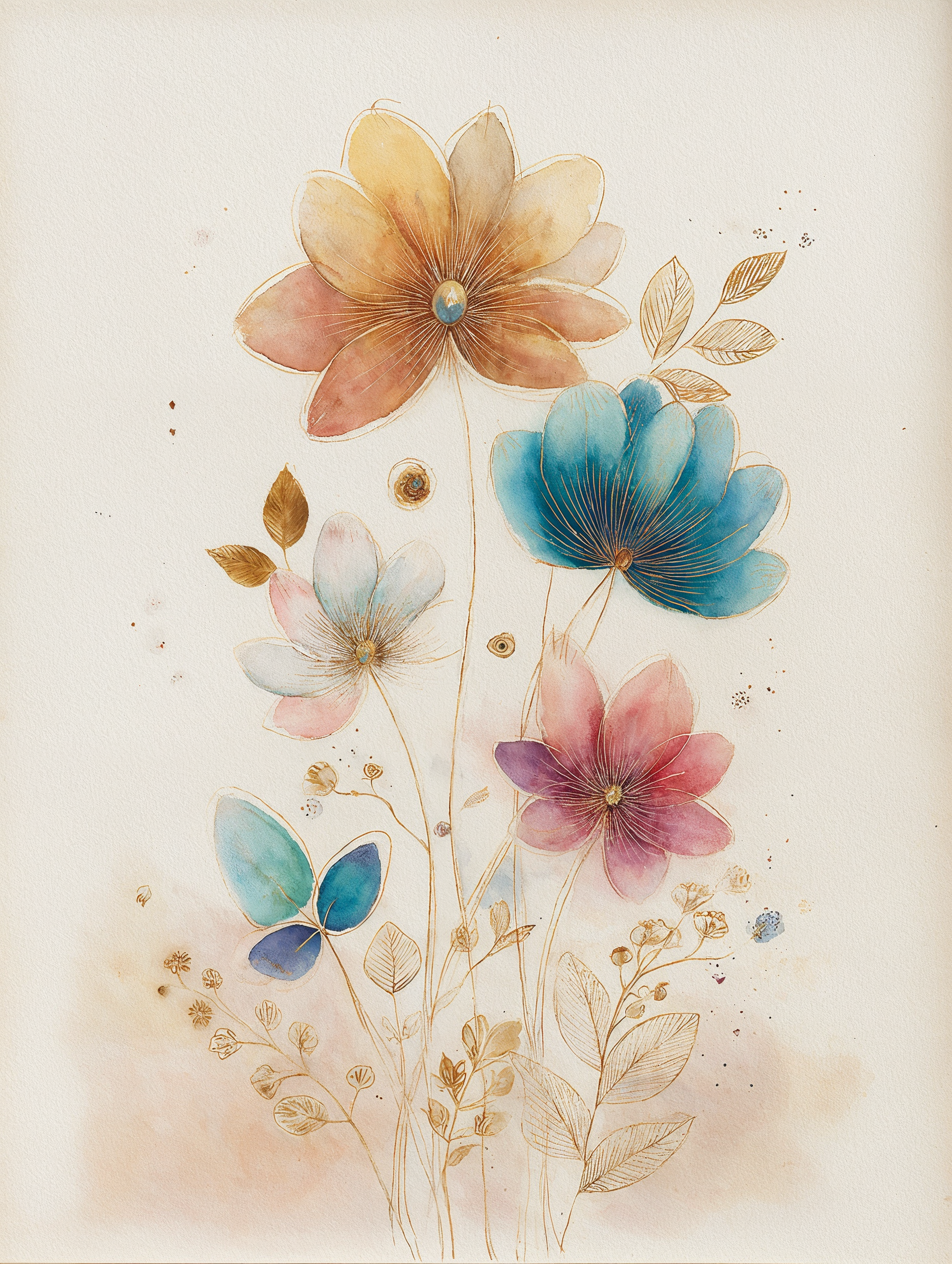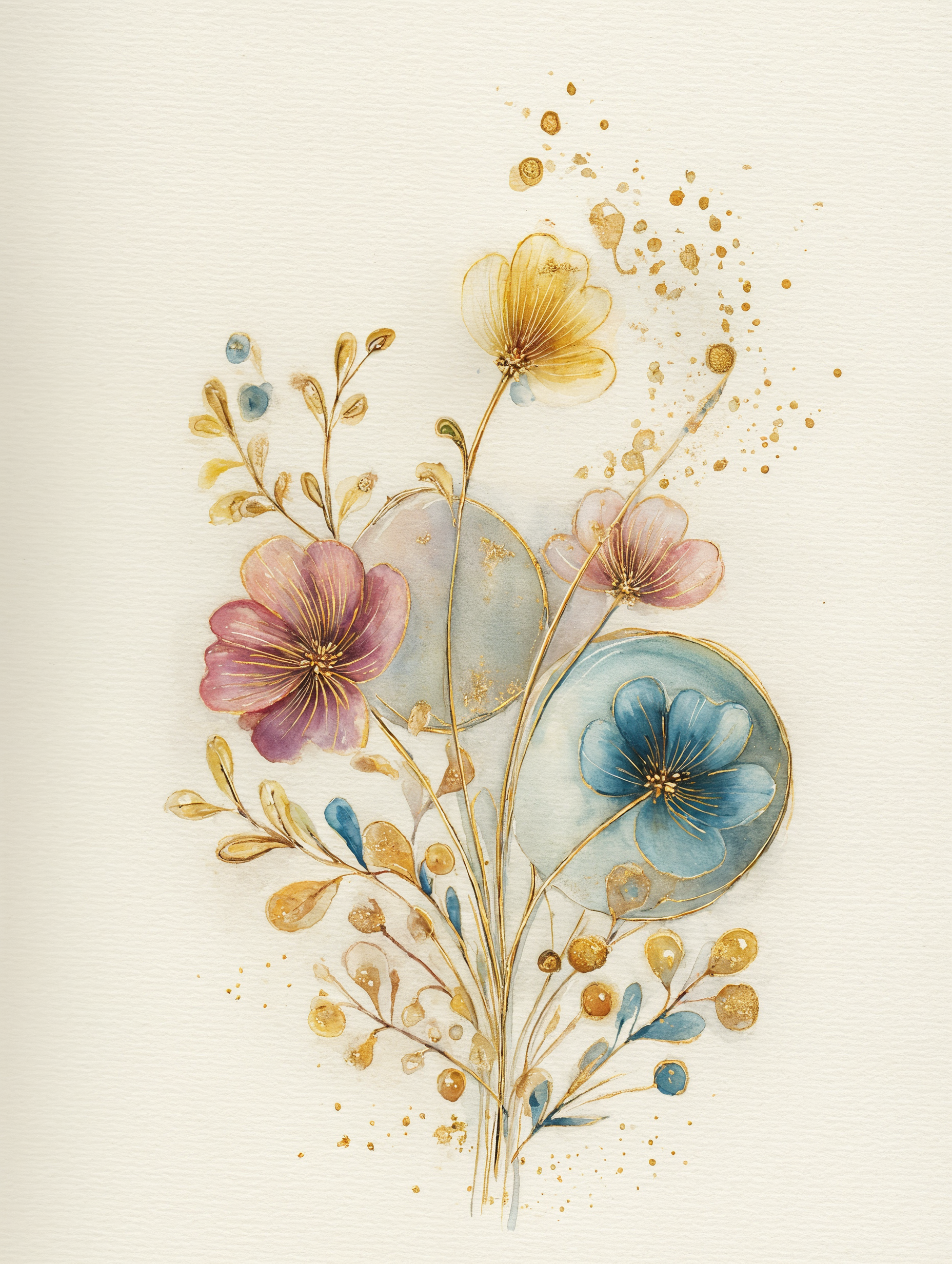 Estas flores creadas con inteligencia artificial combinan delicadeza artística y precisión tecnológica, logrando composiciones que parecen acuarelas pintadas a mano. Los tonos suaves y armónicos, junto con los detalles dorados y las formas orgánicas, transmiten una sensación de calma y elegancia. A través de la IA, la naturaleza se reinterpreta en un estilo etéreo y moderno, transformando lo digital en obras visuales que evocan la belleza de lo natural con un toque poético.