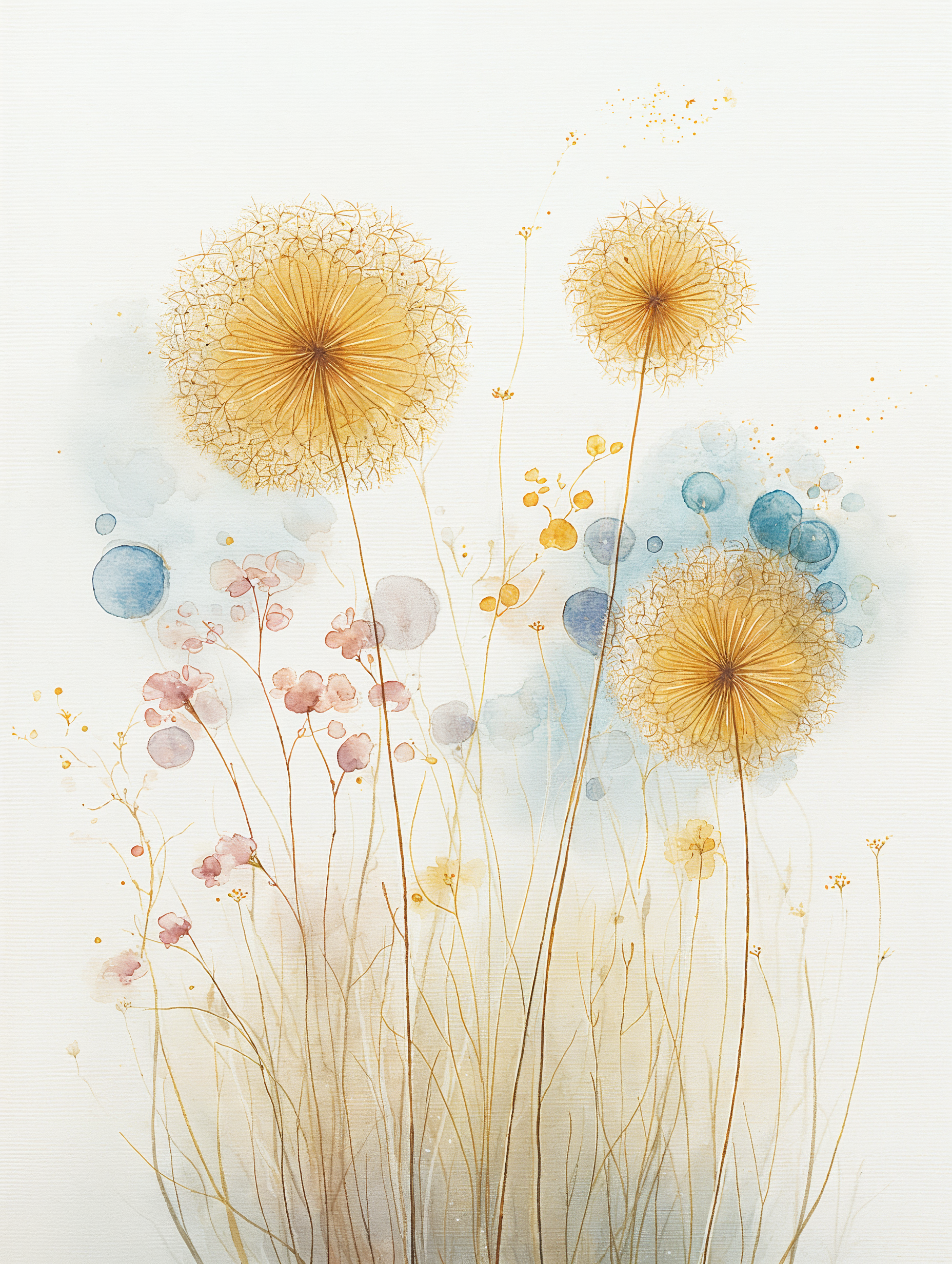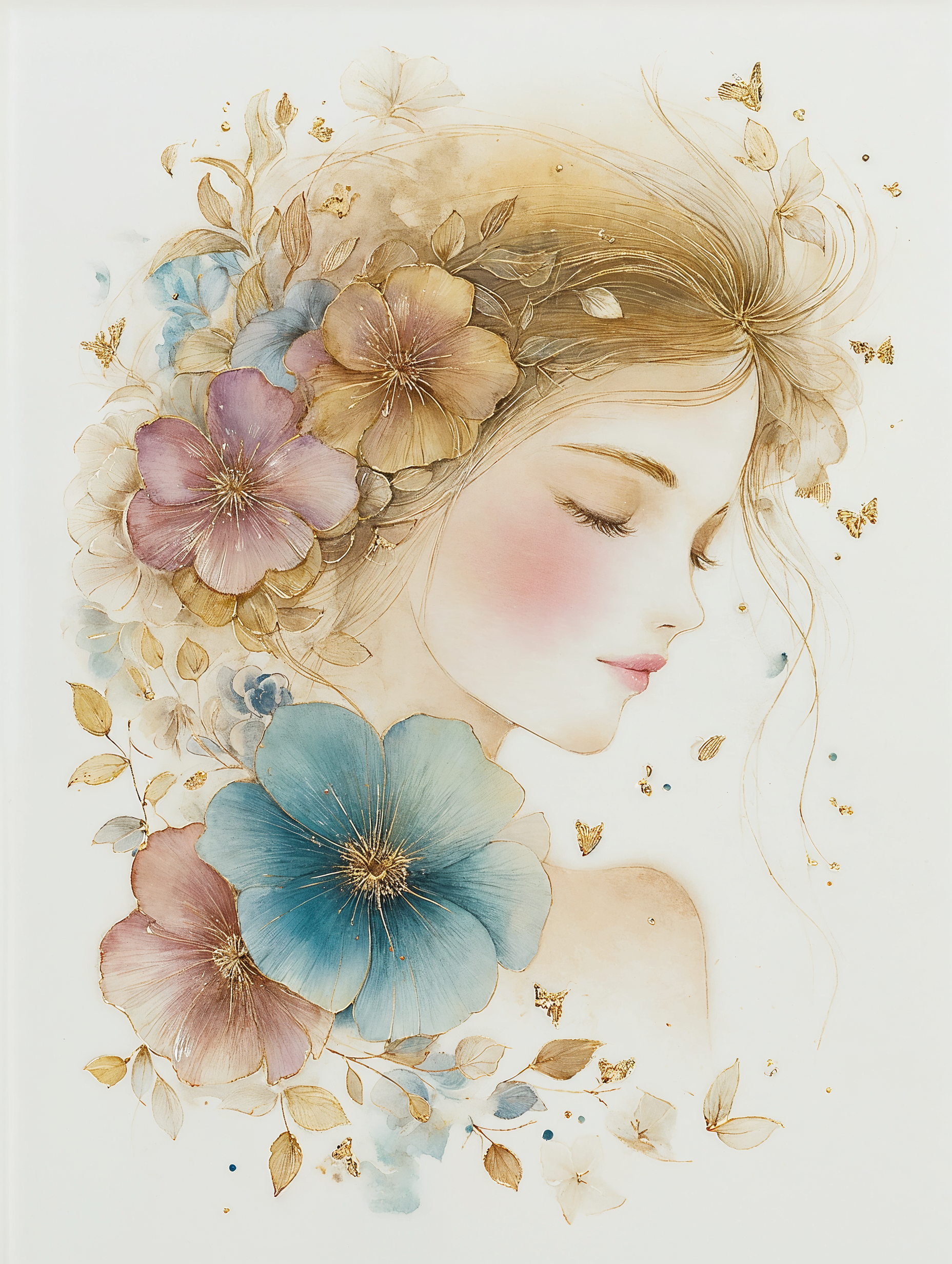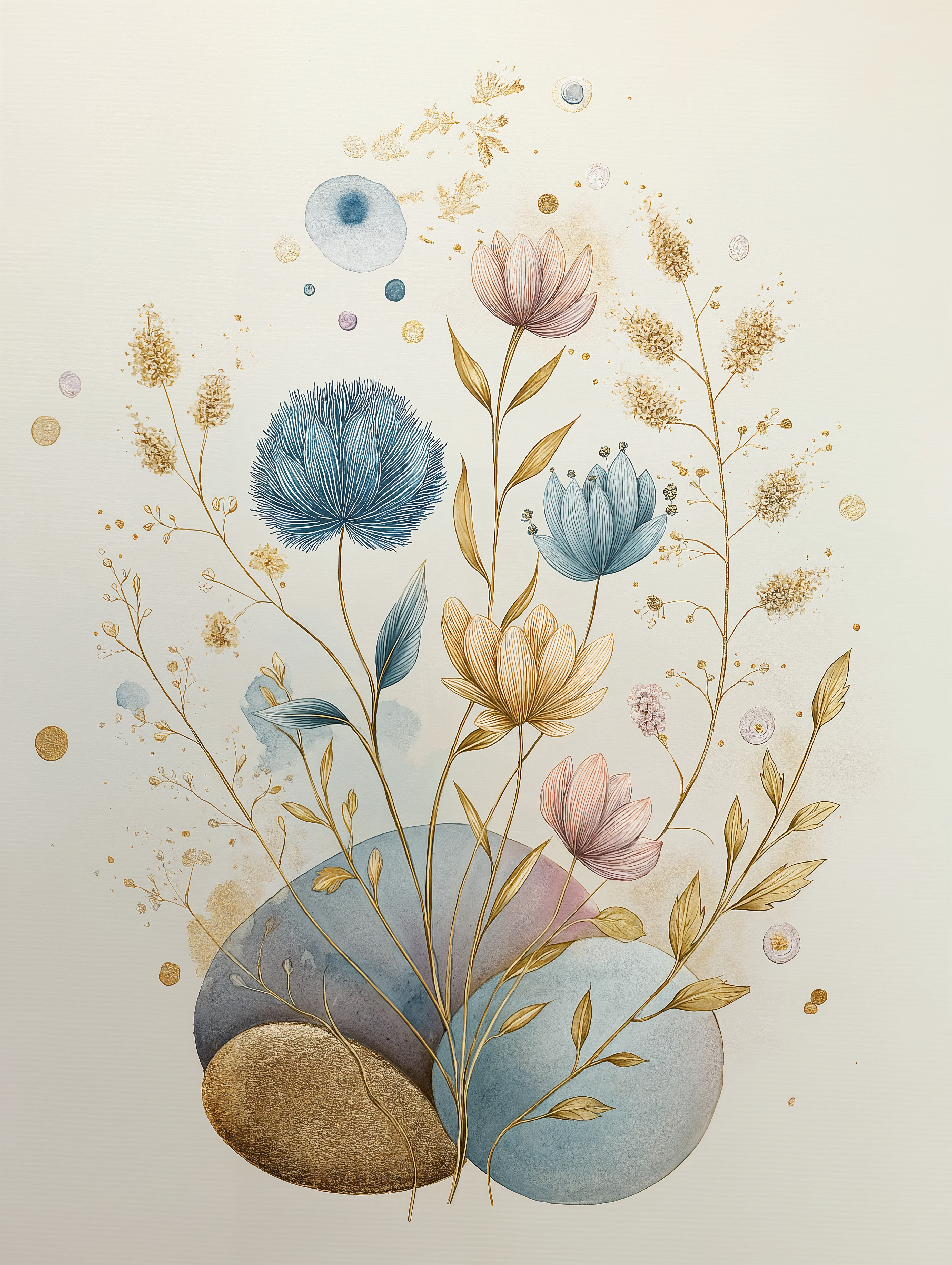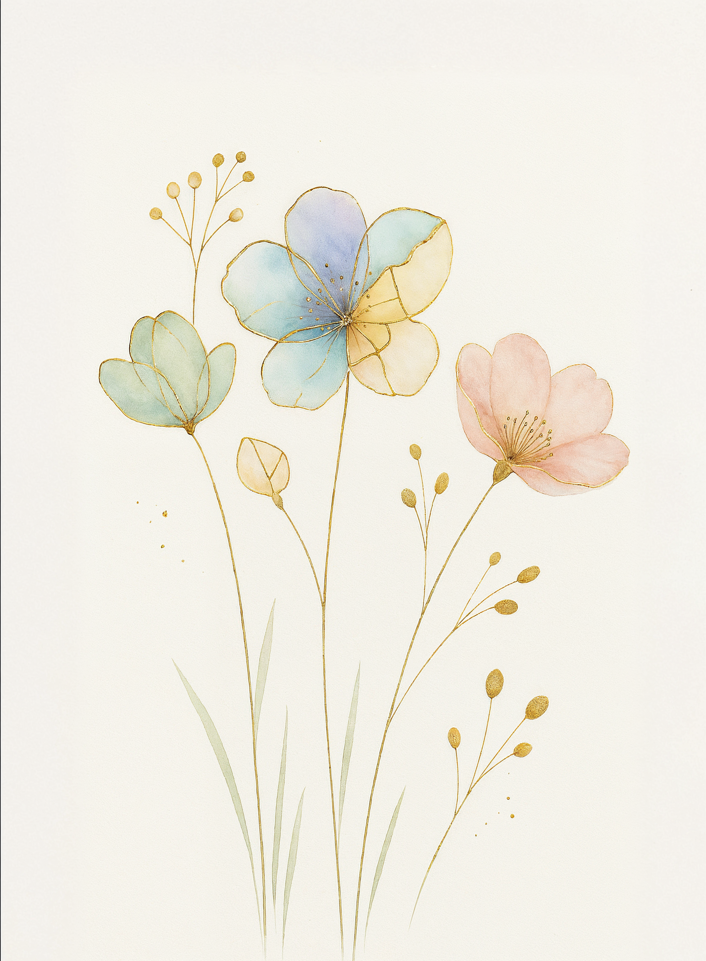 Estas flores creadas con inteligencia artificial combinan delicadeza artística y precisión tecnológica, logrando composiciones que parecen acuarelas pintadas a mano. Los tonos suaves y armónicos, junto con los detalles dorados y las formas orgánicas, transmiten una sensación de calma y elegancia. A través de la IA, la naturaleza se reinterpreta en un estilo etéreo y moderno, transformando lo digital en obras visuales que evocan la belleza de lo natural con un toque poético.